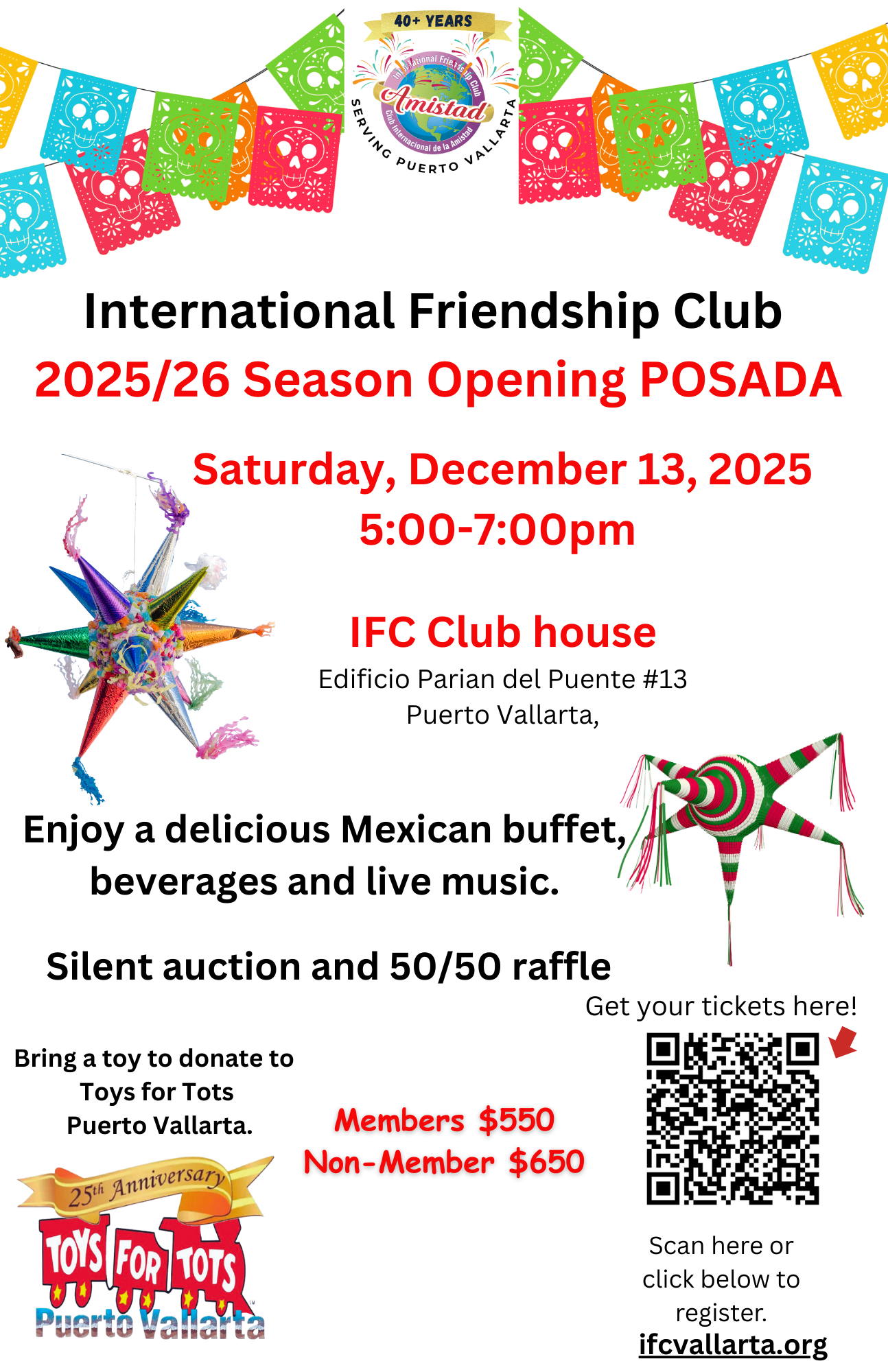 To help bring smiles to over 4,500 children in the Bay of Banderas, we’ve partnered with Toys for Tots Puerto Vallarta toy drive. As you’re preparing to return to paradise, we hope you’ll bring a few toys to donate to this very worthy cause. A toy bin will be available at the IFC opening reception on December 13th through January 5, 2026. Just drop it off.