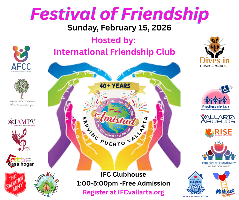 Please join us at the Festival of Friendship, on Sunday, February 15, from 1:00 to 5:00 PM in the IFC Clubhouse and Courtyard, where 18 non-profits will be featured. The afternoon will include presentations by several of the non-profits and musical performances by groups from Casa Hogar children’s shelter, an after-school program at Salvation Army in Mojoneras, and ALAS Escuela del Canto, and a “singing book” by Stolie of LeBib, a bilingual Spanish/English library for Vallarta kids.